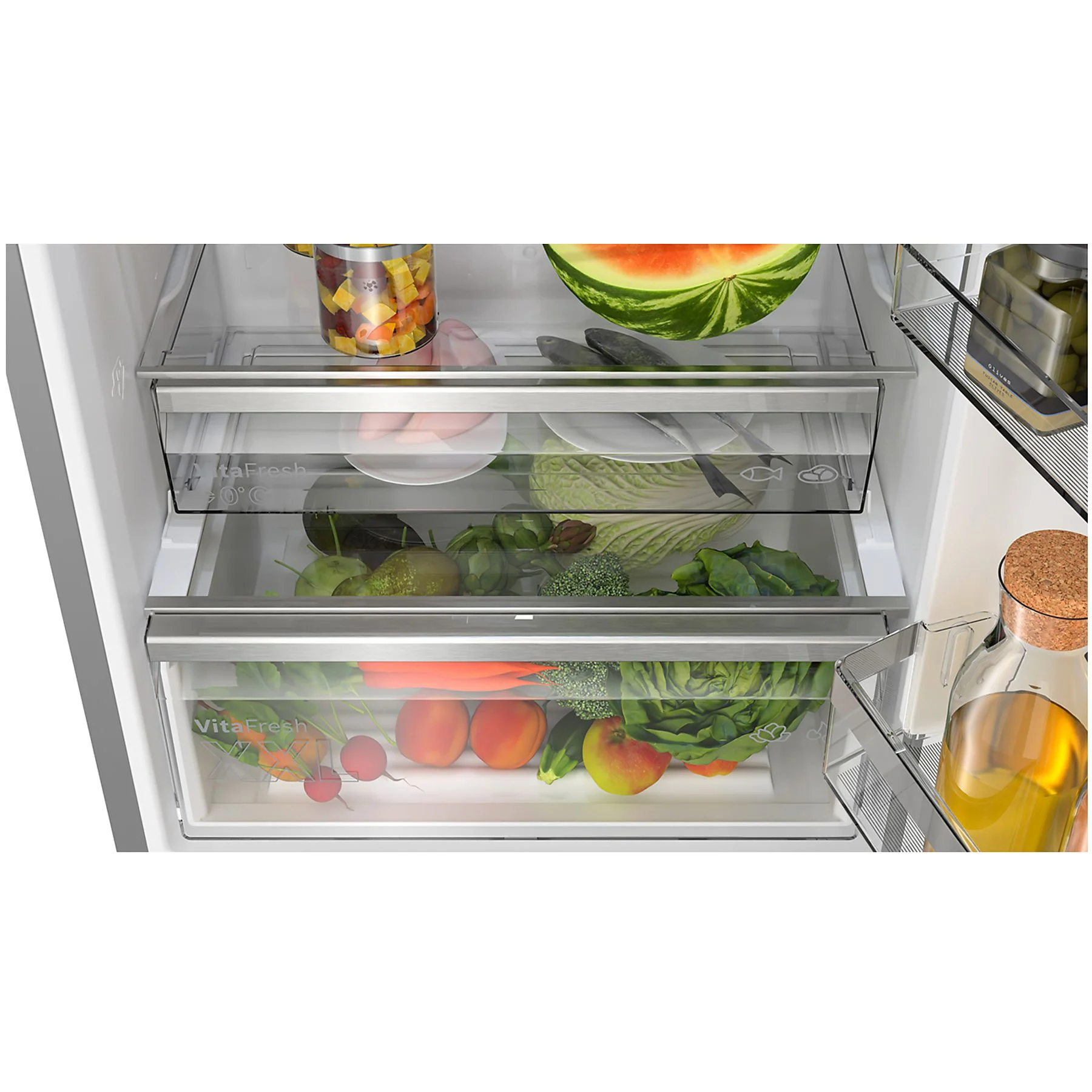 Il sistema VitaFresh XXL <0°C> offre l’ambiente di conservazione ideale per i tuoi cibi freschi. Mantiene la temperatura più bassa per carne e pesce, e ha un cassetto climatizzato che mantiene frutta e verdura veramente fresche.
